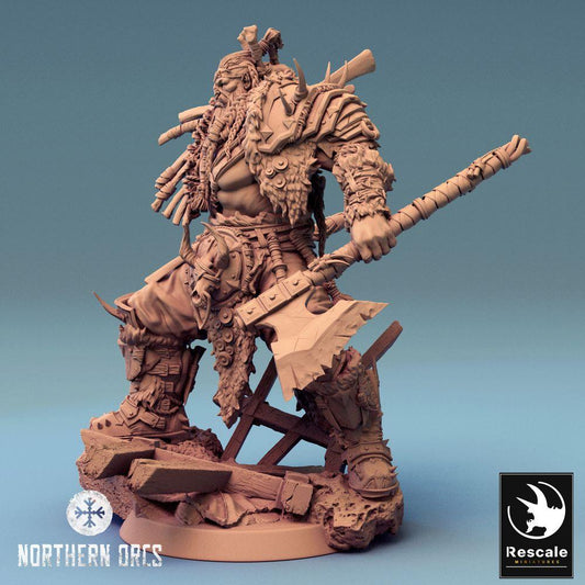 Figurine Fantastique : Orque Warlord / Chef de Guerre Azhrog, Champion Barbare avec Hache à Deux Mains Dentelée (24_04_E3)