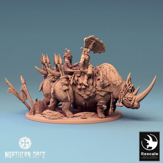 Miniature de Tabletop : Chef de Guerre Orque sur Bête de Guerre Rhinocéros, Équipe de Cavalerie Monstre